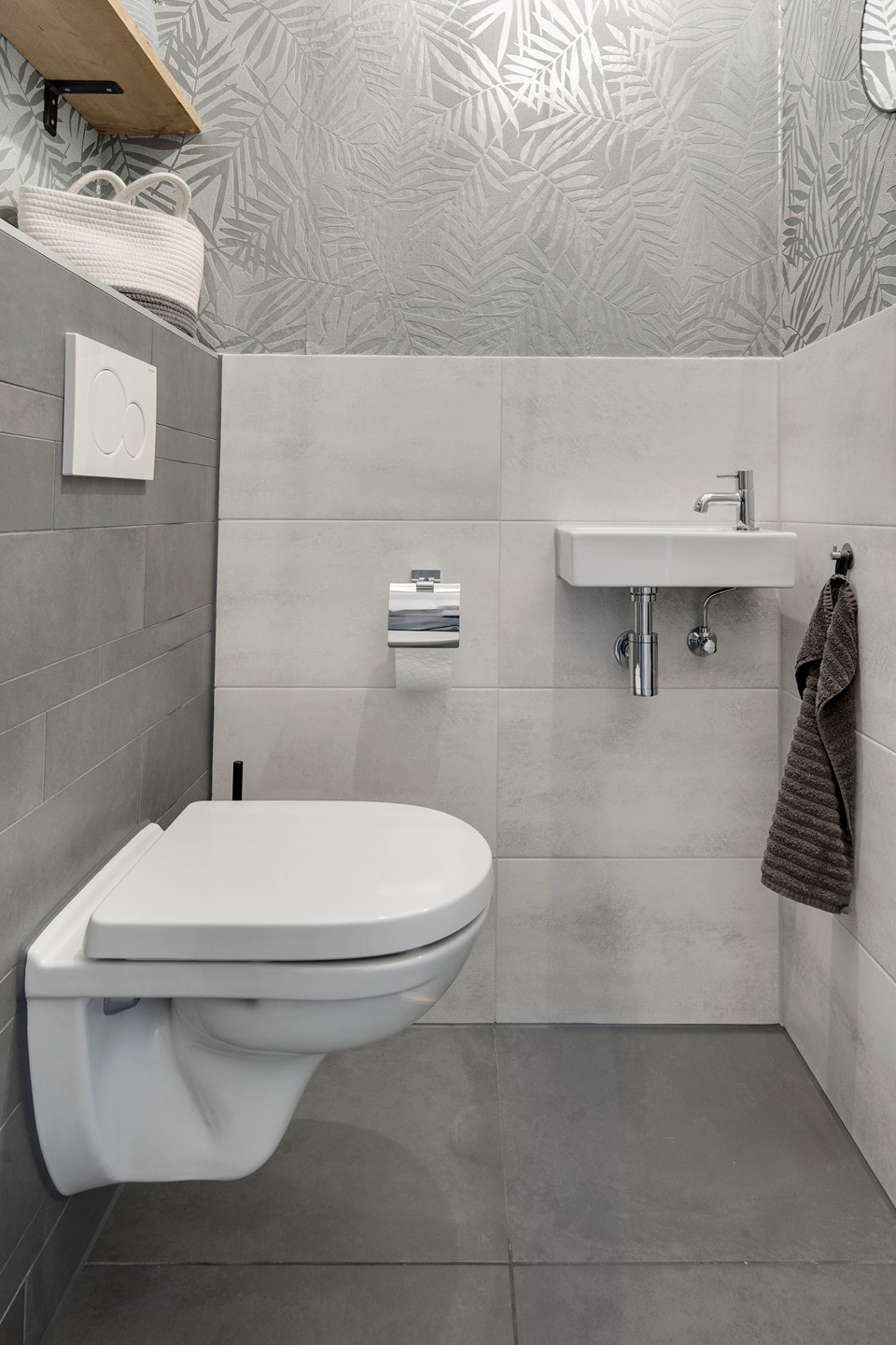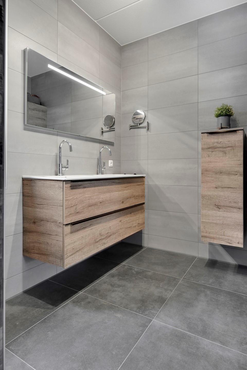 Geheel betegelde badkamer met inloopdouche, kastruimte en dubbel wastafelmeubel.